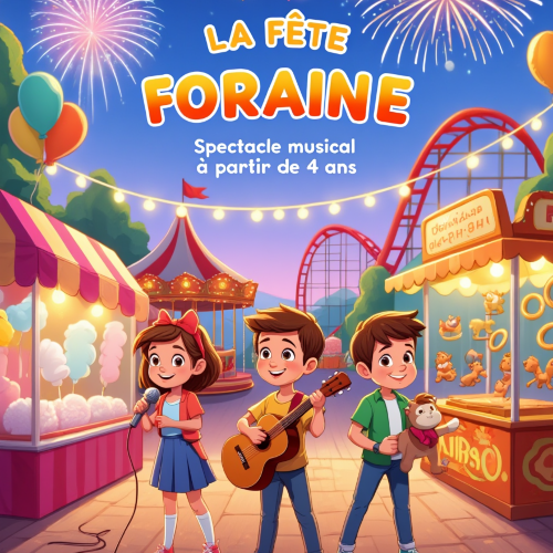 Afficher le planIl s'agit d'un concert plus que d'un spectacle : un concert joyeux, rock, et participatif, d'une durée de 45 minutes. Nous prenons soin de faire chanter les enfants avec nous au maximum, de les faire danser, et avec un sujet comme la fête foraine, la bonne humeur est évidemment de la partie. Les émotions sont aussi abordées : la gourmandise d'une barbe à papa, la frustration de ne pas être arrivé à attraper le pompon, la peur dans le train fantôme, tout est abordé ! Et le final avec des sculptures de ballons raviront les enfants à coups sûrs.