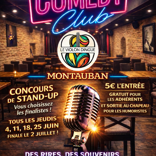 Afficher le planPréparez-vous à des jeudis explosifs au Comedy Club du Violon Dingue ! Tout au long du mois de juin, des humoristes aux styles variés montent sur scène pour tenter de décrocher leur place en finale… et c’est VOUS qui décidez ! Entre vannes percutantes, observations hilarantes et moments d’improvisation, chaque soirée est une véritable battle d’humour où le public devient jury. À la fin du show, votez pour vos artistes préférés et propulsez-les vers la grande finale. Venez entre amis, en couple ou même en solo… l’important, c’est de rire, vibrer et choisir les talents de demain !